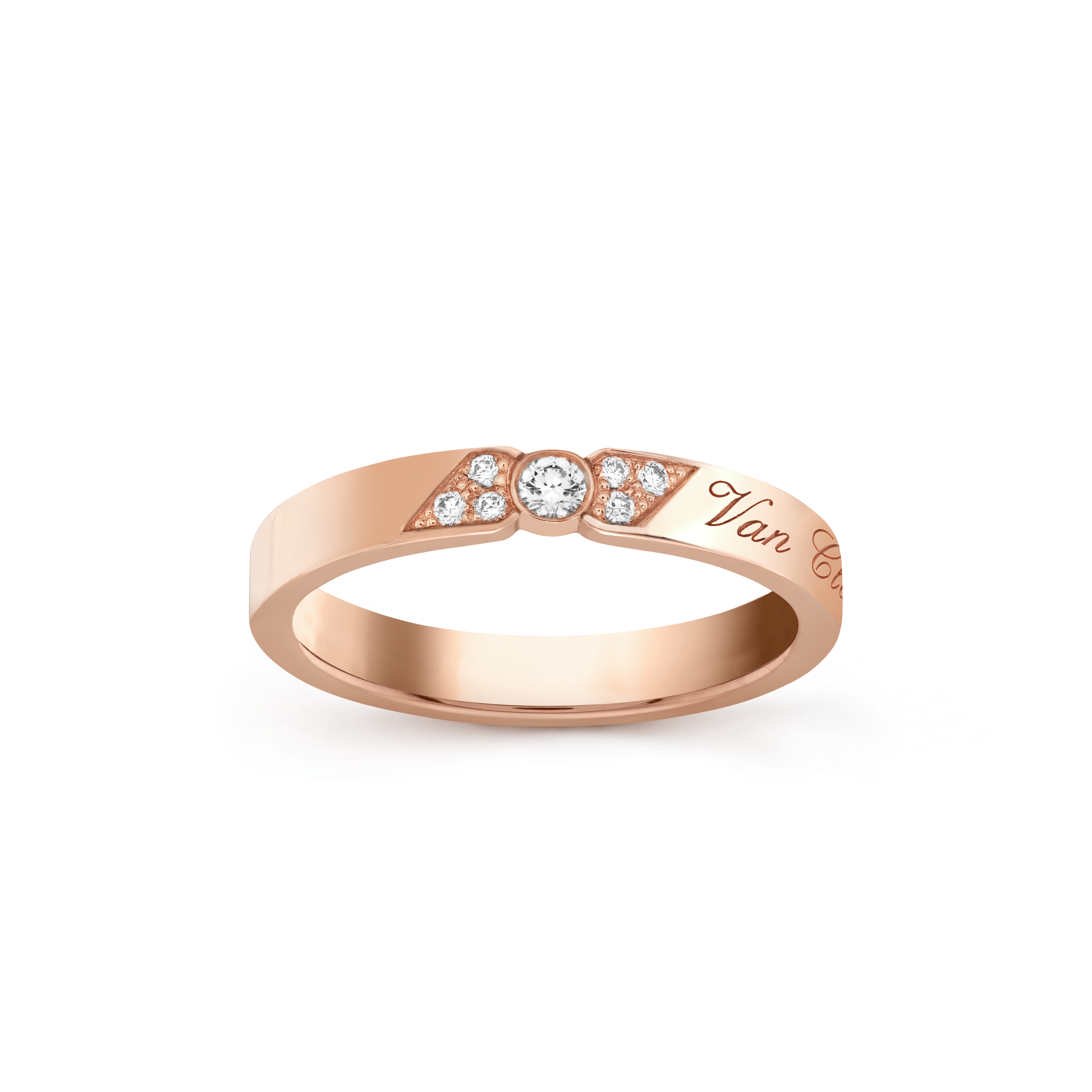 Echoing the world of couture, the 3 mm Toujours Signature Etoiles wedding band features a diamond-stylized bow, with the signature of the Maison engraved into the 18K rose gold: Van Cleef & Arpels.