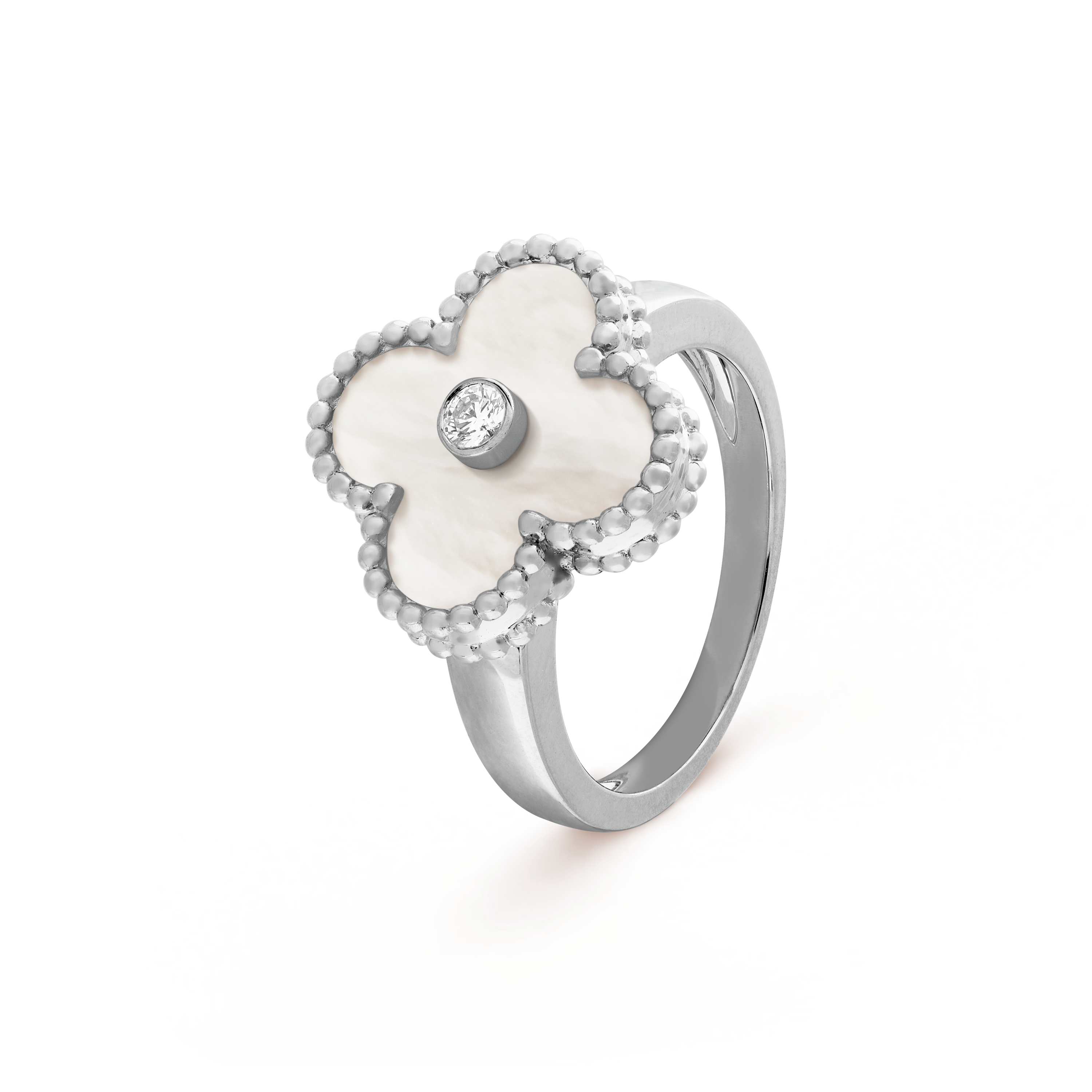 Vintage Alhambra ring, rhodium plated 18K white gold, white mother-of-pearl, diamond.