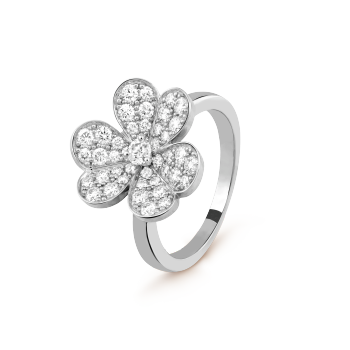 Like so many flowers dancing in the breeze, the Frivole® creations by Van Cleef & Arpels stand out with their graphic and airy aesthetic. Mirror-polished 18K gold or diamonds bestow a singular radiance upon heart-shaped petals. Frivole Between the Finger ring, rhodium plated 18K white gold, diamonds